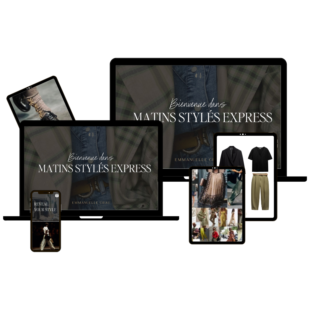 MATINS STYLÉS EXPRESS est la synthèse de ma méthode et de tous les outils, astuces et conseils que je donne pour savoir quoi porter chaque matin et s'habiller avec style, rapidement.