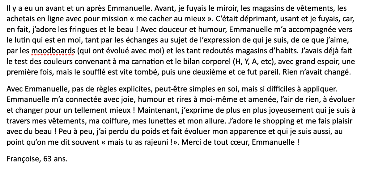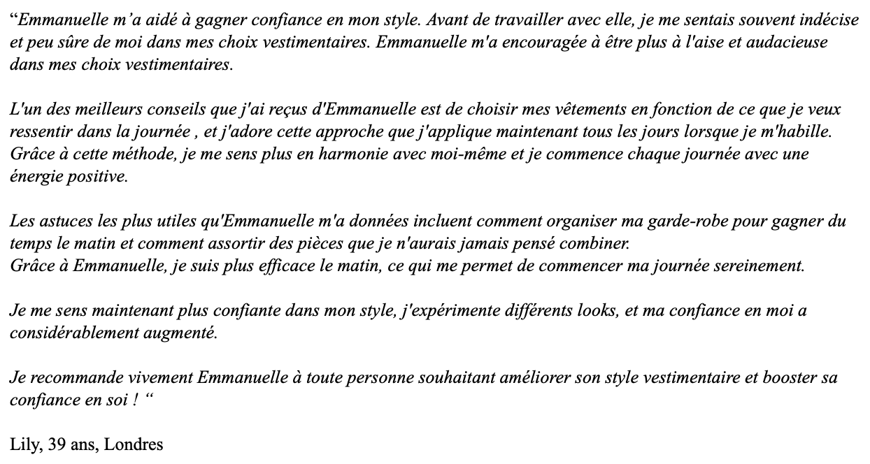 “Emmanuelle m’a aidée à gagner confiance en mon style. Avant de travailler avec elle, je me sentais souvent indécise et peu sûre de moi dans mes choix vestimentaires. Ces conseils m'ont encouragée à être plus à l'aise et audacieuse dans mes choix vestimentaires”